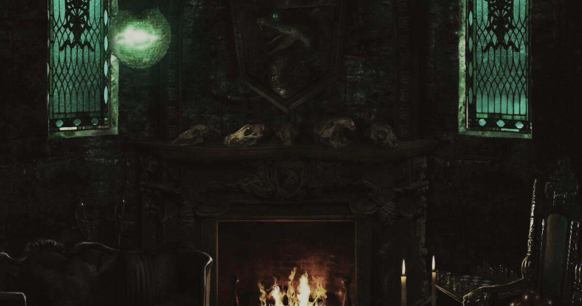 La Sala Común de Slytherin, escondida en las mazmorras, cercana al lago negro. Su entrada secreta se abre con una contraseña, revelando un espacio iluminado por antorchas verdes. Los tonos verdes y plateados dominan, creando una atmósfera de misterio. Sofisticados sofás de cuero y mesas elegantes brindan un lugar para la planificación estratégica y la ambición compartida entre los estudiantes de esta casa.