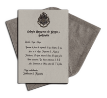 Querido Mago o Bruja:Tenemos el places de informarle de quue dispone de una plaza en el Colegio Hogwarts de Magia y Hechicería. Por favor observe la lista del equipo y los libros necesarios. La clases comienzan el 1 de septiembre, esperamos su lechuza antes del 31 de julio.Muy cordialmente,